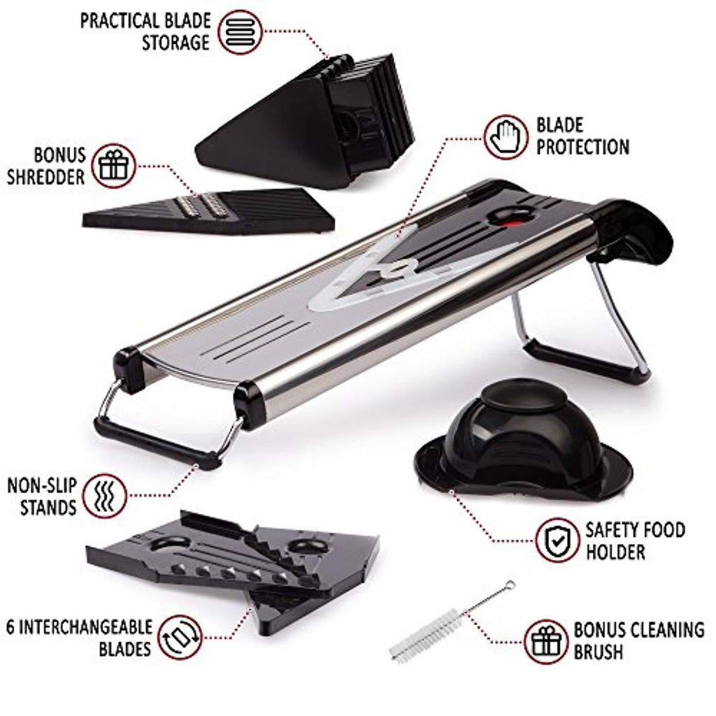 • EASY TO USE – This simple and yet versatile mandoline slicer will allow you to cook all your favorite dishes in a matter of minutes whether you are a professional chef or a housewife. With this perfect vegetable slicer preparing a masterpiece healthy meal has never been easier