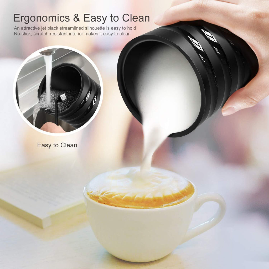 【Enough for All】 Holds 3.9 oz / 115 ml of super dense foam for a perfect cup of cappuccinos or heating 8.20oz./240ml with a small amount of frothing, 8.1 oz / 40 ml of hot milk for lattes and flat whites.