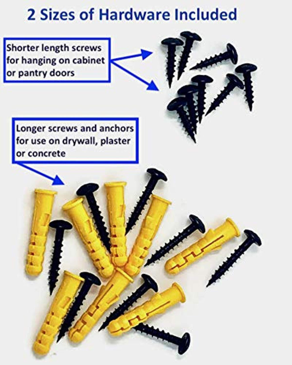 • Hang on wall, cabinet door, or place on countertop -- 2 sizes hanging hardware included