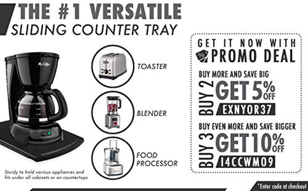 - THE #1 VERSATILE SLIDING COUNTER TRAY - Whatever it is - Keurig coffee makers, Cuisinart, Hamilton, Kitchenaid, Vitamix blenders, food processors - our 12 inch coffee machine sliding tray is guaranteed to ease up your burdens by holding out all types of kitchen appliances from light to heavy ones up to about 25 lbs. This counter top rolling tray will do its job without trouble, fitting nicely under your kitchen cabinets and on countertops!