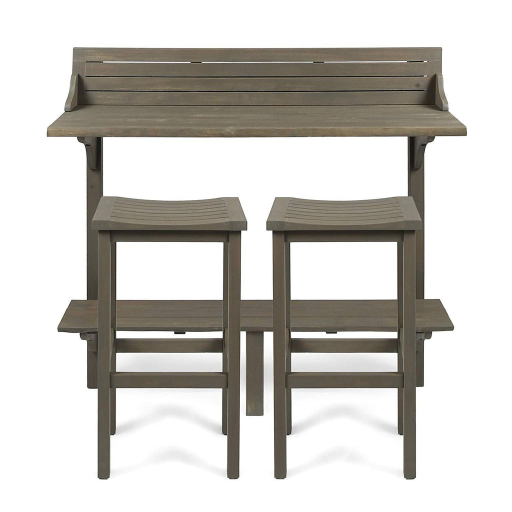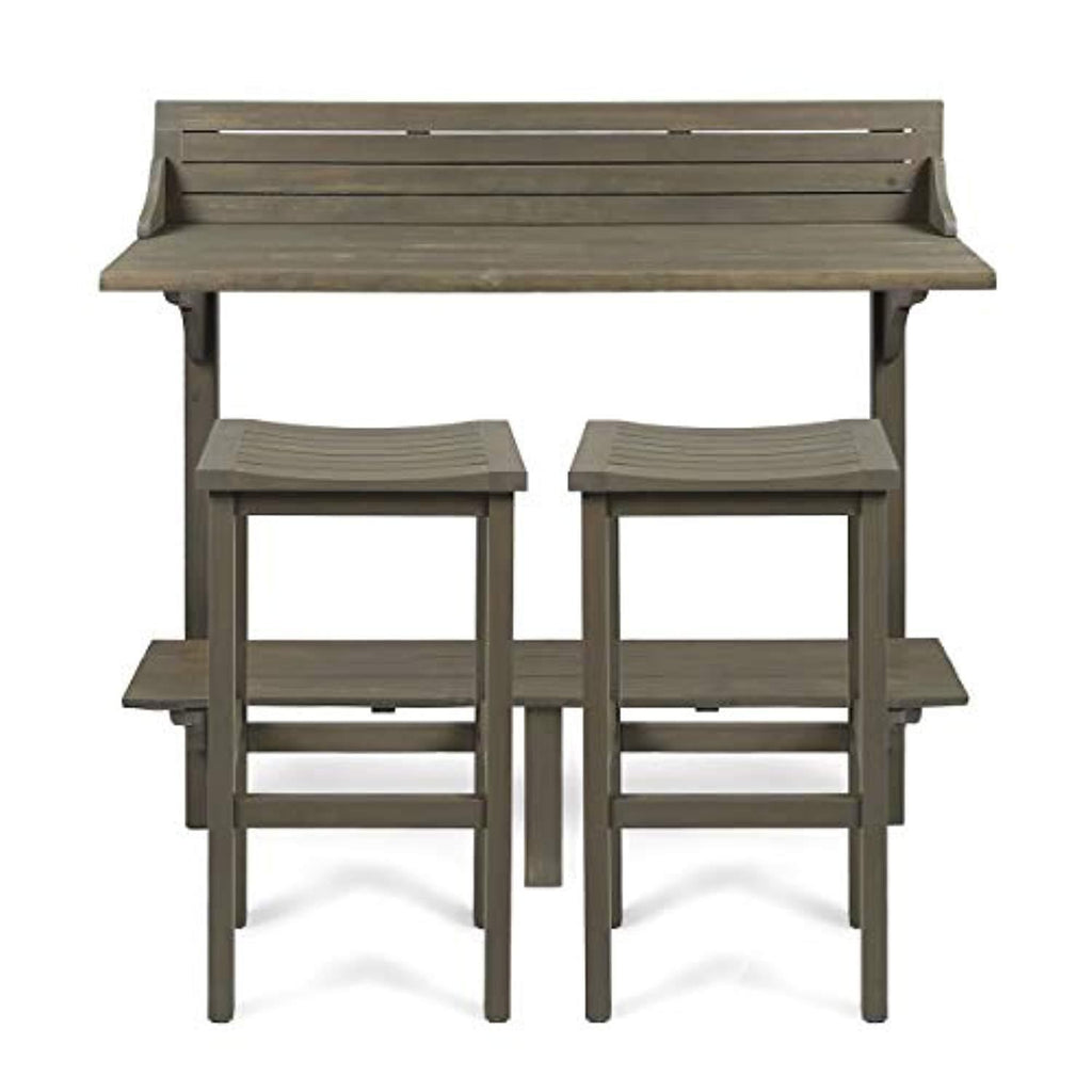 - Includes: One (1) Balcony Bar Table and Two (2) Barstools. Material: Acacia Wood. Finish: Grey