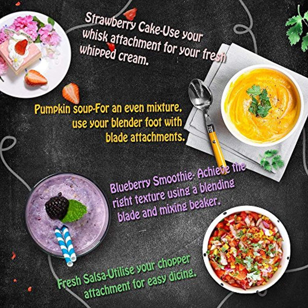 Includes stick blender shaft, stainless egg whisk, 500ml chopper bowl, 600ml mixing beaker, perfect for making baby food, smoothies, soups, mayonnaise, meringue, chutney, salsas, crêpe batters et.